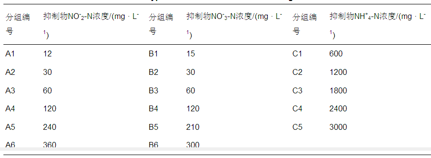 在100 mL血清瓶中加入60 mL配水,pH穩(wěn)定在7.3±0.3,分別向3組血清瓶中加入一定量的NaNO2、NaNO3和NH4Cl貯備液,具體抑制物質(zhì)及濃度情況見表 1.加入40 mL厭氧顆粒污泥,使用高純氮?dú)獯得摷s5 min去除血清瓶中的溶解氧,密封后置于35 ℃恒溫水浴振蕩器中進(jìn)行培養(yǎng),每個濃度梯度設(shè)3個平行.