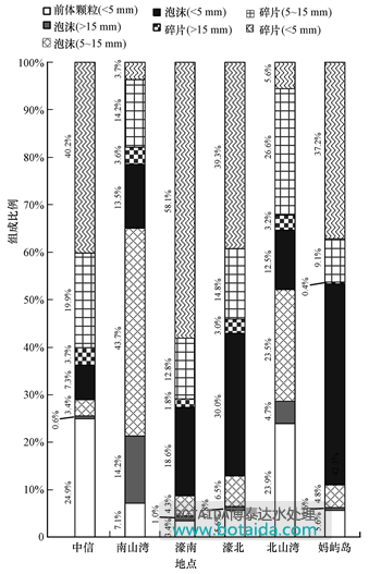 另外,不同尺寸級別的塑料垃圾數量比例也存在差異(圖 1).除南山灣和北山灣以外,其余4個沙灘中微型塑料總數所占比例都較高(高于70%),北山灣和南山灣的塑料垃圾中占比最大的尺寸主要集中在5~15 mm(占比均高于50%),且以泡沫為主.北山灣和中信北部沙灘上的中型塑料碎片(5~15 mm)比例較高,這些都可能成為該地區(qū)后期微型塑料污染的潛在來源.