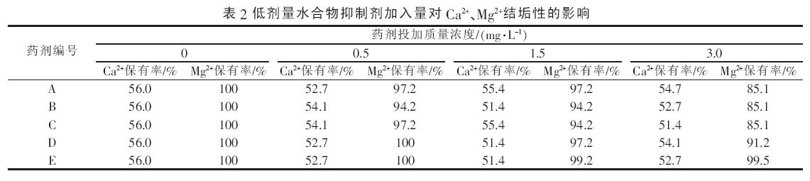 為驗證低劑量水合物抑制劑對油田污水結(jié)垢性的影響,按表1 配制強(qiáng)結(jié)垢型的油田污水,并添加質(zhì)量分?jǐn)?shù)為0.5%~3%低劑量水合物抑制劑進(jìn)行試驗,結(jié)果見表2?試驗表明,對于具有較強(qiáng)結(jié)垢趨勢的油田水質(zhì),加入水合物抑制劑后,Ca2+的保有率比空白稍有下降,但不顯著,即水合物抑制劑的加入對油田污水碳酸鈣垢的沉積不會造成太大的影響?除了E外, 隨著A~D 水合物抑制劑用量增加,Mg2+的保有率有不同程度的下降, 表現(xiàn)出對油田污水中Mg2+的沉積有一定的促進(jìn)作用?