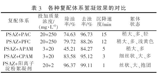 由表2 可知:6 種絮凝劑中,PAC?PFC?APAM?CPAM 對廢水中油的去除效果較差, 而PSAZ 和陽離子淀粉絮凝劑對油的去除效果相對較好?其原因是PSAZ 除了具有單元無機(jī)高分子絮凝劑的共同優(yōu)點(diǎn)外,其異核金屬離子的交錯排列能夠形成更長?更穩(wěn)定的分子鏈,一方面增加了其聚合度和分枝程度,使網(wǎng)捕作用加強(qiáng); 另一方面金屬離子的引入增加了所帶的電荷量,使其吸附電中和能力提高,增加了其處理效果?陽離子淀粉絮凝劑的處理效果雖然次于PSAZ,但其沉淀速度是最快的,這就縮短了處理時間,提高了處理效率?各種復(fù)配體系絮凝效果的對比如表3 所示?