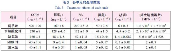 調(diào)試運(yùn)行結(jié)束后,出水水質(zhì)基本穩(wěn)定,各項(xiàng)污染物指標(biāo)均達(dá)到排放標(biāo)準(zhǔn),具體處理效果見(jiàn)表3 (表內(nèi)數(shù)據(jù)為連續(xù)5 d 監(jiān)測(cè)結(jié)果平均值±單倍標(biāo)準(zhǔn)偏差) 。