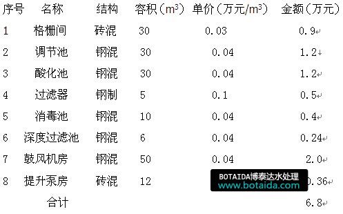 本工藝總裝機(jī)容量為9kw,常用容量3.5kw,每度電按0.6元計,則日耗電費(fèi)50.4元,年耗電費(fèi)18396元(以1年365個工作日計,下同),折算1m3污水耗電0.42元。