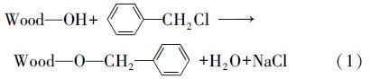 參照文獻(王東華等,2000)方法,在帶有攪拌機、溫度計和回流裝置的250 mL三口燒瓶中,加入20.0 g脫脂杉木粉和10% NaOH水溶液80~120 mL,攪拌均勻后讓其潤脹 30 min,然后加入 80~120 mL氯化芐和80 mL甲苯,攪拌下于110 ℃ 油浴中加熱反應(yīng)到設(shè)定時間,冷卻并加入少量水,抽濾,分別用50 mL 50%乙醇洗滌兩次,100 mL水洗滌兩次,再用50 mL 95%乙醇洗滌兩次,抽干,在60 ℃下干燥至恒重,得芐基化杉木粉,簡稱“芐基化木粉”,轉(zhuǎn)入干燥器中,并計算增重百分率(WPG).木粉芐基化改性的化學反應(yīng)式如下:
