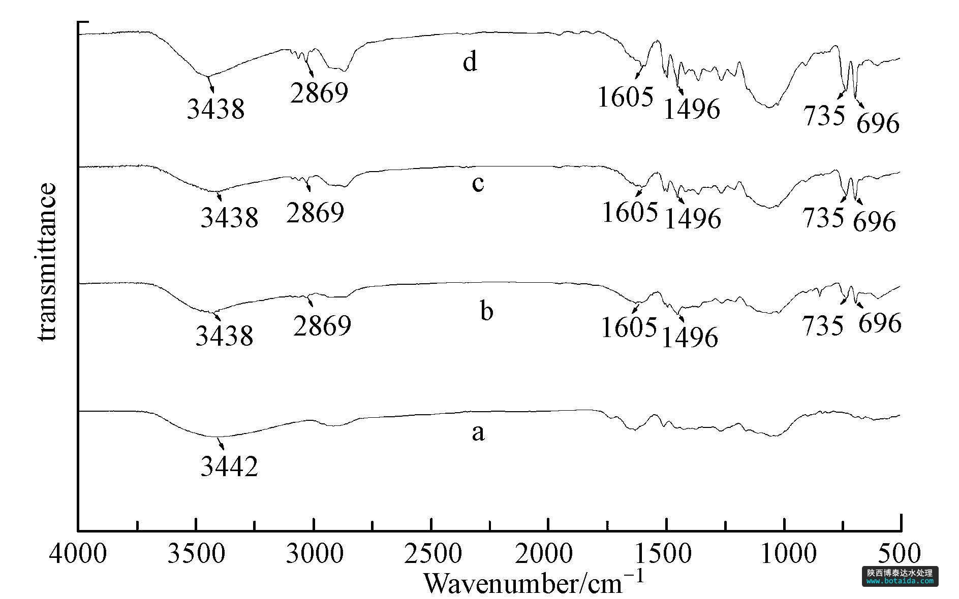 分析 采用Nicolet Avatar-330紅外光譜儀對脫脂木粉、芐基化木粉、多微孔芐基化木粉和吸附后的多微孔芐基化木粉進行了表征(圖 1).對比原木粉(圖 1a)和芐基化木粉(圖 1b)的紅外光譜圖發(fā)現(xiàn),原木粉經(jīng)芐基化改性后,羥基振動吸收峰由3442 cm-1移向3438 cm-1,在1605 cm-1、1496 cm-1處的兩重峰及735 cm-1、696 cm-1處的強吸收峰均顯示單取代苯環(huán)的特征吸收.另外,2868 cm-1處出現(xiàn)的振動吸收峰表明了木材中的部分羥基已經(jīng)被芐基所取代.對比芐基化木粉(圖 1b)和多微孔芐基化木粉(圖 1c)的紅外光譜圖發(fā)現(xiàn),圖譜形態(tài)變化不大,無新的官能團吸收峰出現(xiàn),表明芐基化木粉經(jīng)水熱處理后,木粉的化學組成沒有發(fā)生明顯變化.對比多微孔芐基化木粉(圖 1c)與吸附后的多微孔芐基化木粉(圖 1d)的紅外光譜圖,發(fā)現(xiàn)其吸收峰的波數(shù)基本一致,表明吸附對木粉的化學組成沒有產(chǎn)生明顯影響.