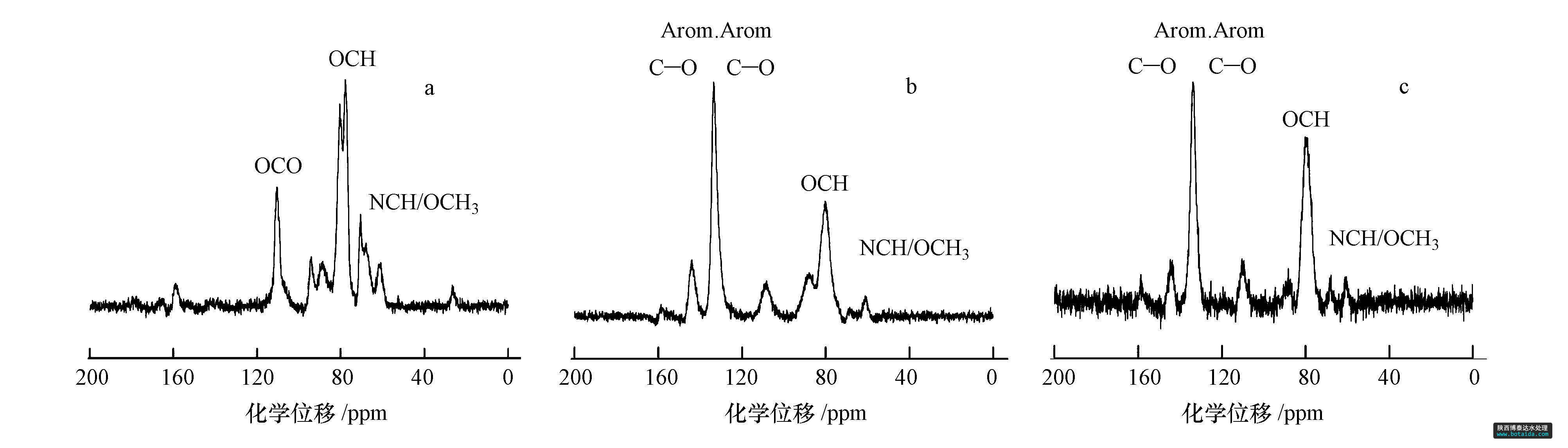 圖3 脫脂木粉(a)、芐基化木粉(b)和多微孔芐基化木粉(c)的13C NMR 圖