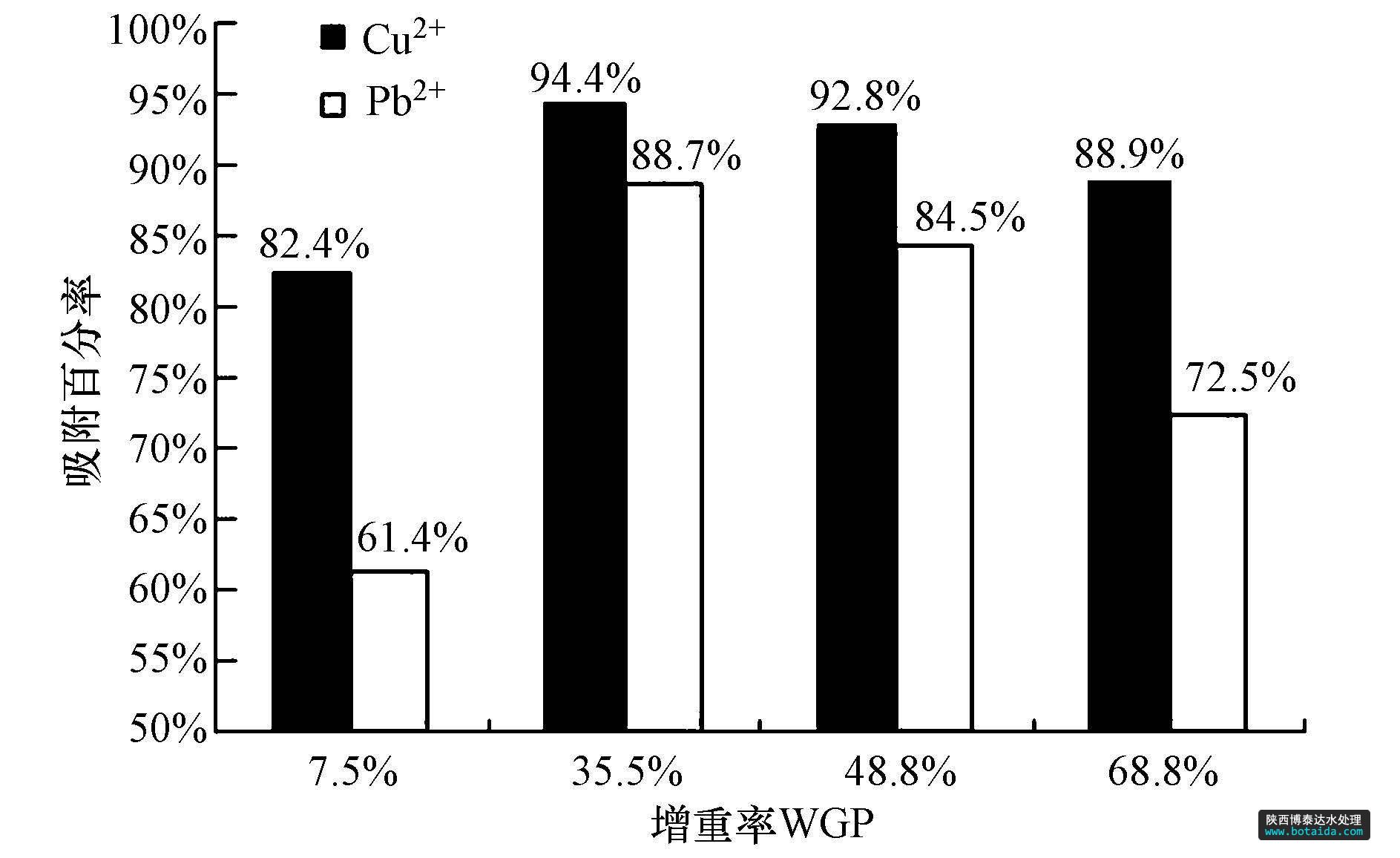 圖7 芐基化木粉的增重率對Cu2+和Pb2+吸附百分率的影響