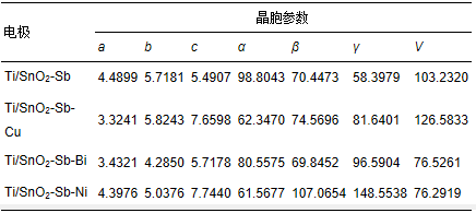 通過XRD分析軟件(X′Pert highscore plus)對數(shù)據(jù)進(jìn)行分析(晉勇等,2008)得到各電極的晶胞參數(shù)見表 1,分析表中數(shù)據(jù)發(fā)現(xiàn),對Ti/SnO2-Sb電極進(jìn)行金屬摻雜改性后,晶胞參數(shù)發(fā)生改變,主要體現(xiàn)在晶胞體積的增大或減小,這是由于各金屬離子成鍵半徑不同,當(dāng)金屬離子以固溶或者類質(zhì)同相的形式取代Sn4+進(jìn)入SnO2晶格內(nèi)部,必然引起金屬氧鍵的鍵長發(fā)生變化,從而造成晶胞參數(shù)的改變.XRD圖譜和晶胞參數(shù)等數(shù)據(jù)表明,通過金屬摻雜改性使金屬離子進(jìn)入到SnO2晶格中,其中,Cu和Ni以其p型半導(dǎo)體的性質(zhì)形成了空穴點(diǎn)位(劉淼等,2013),使電極表面形成較為密集的蜂窩狀,微觀結(jié)構(gòu)(圖 1)中也觀察到電極無裂縫且蜂窩狀結(jié)構(gòu)分布均勻,這樣的結(jié)構(gòu)可以增加電極的活性點(diǎn)位而提高電催化性能;而Bi則為n型半導(dǎo)體,與SnO2有著相似的性質(zhì),進(jìn)入SnO2晶格后主要通過增加自由電子的濃度來達(dá)到增強(qiáng)導(dǎo)電能力的效果.