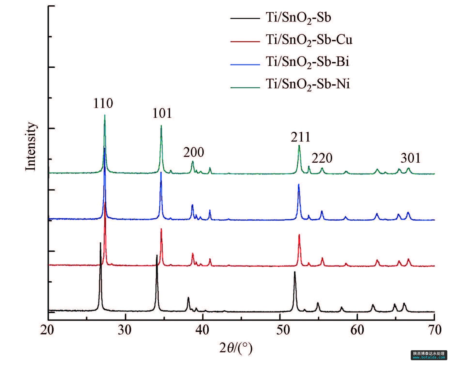 對所制備電極進(jìn)行XRD分析.從圖 2數(shù)據(jù)可見,所有電極的X衍射峰的位置跟四方形金紅石型的SnO2晶體結(jié)構(gòu)的標(biāo)準(zhǔn)卡片(00-041-1445)的峰數(shù)據(jù)基本一致,并未檢測到Sb及摻雜金屬相應(yīng)氧化物的衍射峰,表明金屬摻雜并沒有改變SnO2晶體結(jié)構(gòu).這可能是因為金屬離子進(jìn)入SnO2的晶格中取代了晶格中Sn4+的部分位置(李子榮和張雪梅,2006),以金屬氧化物的形式固溶到SnO2的晶格中,因而在XRD中Sb及摻雜的金屬沒有以單獨(dú)的氧化物形式存在.但是摻雜金屬后電極的X射線衍射峰位置發(fā)生了微小偏移,主要由于金屬離子與被替代的Sn4+之間離子半徑存在差異,以及金屬離子加入后出現(xiàn)的氧空穴而造成晶格缺陷.