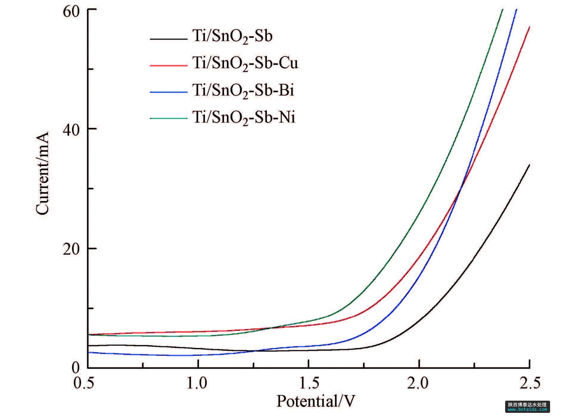 電極的析氧電位是影響有機(jī)物電化學(xué)降解效率的重要因素,有機(jī)物在陽極發(fā)生氧化的同時,伴隨著析氧副反應(yīng).析氧反應(yīng)的發(fā)生主要是因為電極表面吸附的· OH和轉(zhuǎn)移到晶格內(nèi)的O不穩(wěn)定,除了可與有機(jī)物發(fā)生反應(yīng)外,還可能以O(shè)2的形式釋放(李善評等,2008).當(dāng)析氧電位低時,通過的電流大部分用于氧氣的析出,導(dǎo)致有機(jī)物降解效率降低;當(dāng)析氧電位高時,氧氣難于析出,有機(jī)物在陽極直接被氧化降解的概率就會增加.因此,較高的析氧電位是催化電極的一個重要指標(biāo).