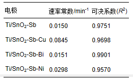 反應(yīng)速率常數(shù)越大說明有機(jī)物的降解速率越快,從表中可以看出在相同條件下,p-DCB在各電極上的反應(yīng)速率常數(shù)由大到小依次為KTi/SnO2-Sb-Cu,KTi/SnO2-Sb-Ni,KTi/SnO2-Sb-Bi,KTi/SnO2-Sb.因此p-DCB在Ti/SnO2-Sb-Cu電極上的降解速率最快,在Ti/SnO2-Sb電極上的降解速率最慢,可見金屬元素的摻雜對p-DCB的降解起到了促進(jìn)作用。