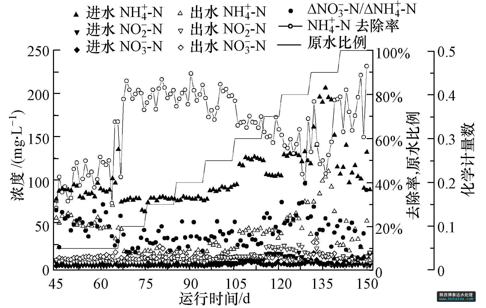 CANON工藝始終在中溫(30.0±0.5)℃條件下運(yùn)行,其中,CANON工藝的啟動(dòng)分為3個(gè)階段:①ANAMMOX顆粒污泥活性恢復(fù)階段,反應(yīng)器的HRT 4.0 h,嚴(yán)格厭氧;②于反應(yīng)器內(nèi)接種硝化污泥,反應(yīng)器由厭氧狀態(tài)過(guò)渡至微氧狀態(tài)以啟動(dòng)CANON工藝,DO(0.50±0.05)mg · L-1,HRT 7.8 h;③微生物的馴化階段,CANON工藝啟動(dòng)完成后,原水比例按照10%的濃度梯度遞增的方式對(duì)微生物進(jìn)行馴化,原水比例10%,HRT為7.8 h;20%~50%原水,HRT為13 h;60%~90%原水,HRT為19 h;90%~100%原水,HRT為38 h.