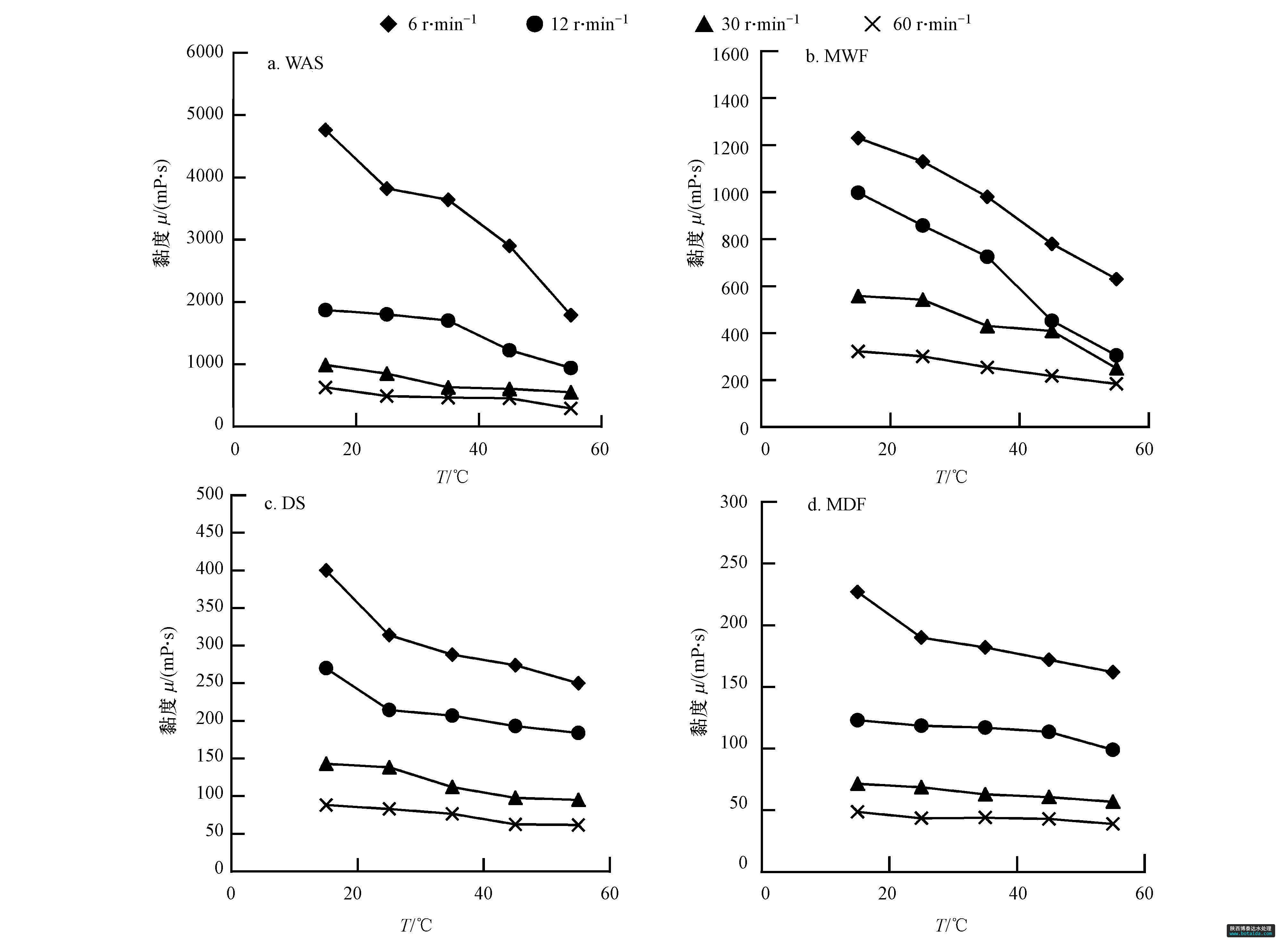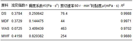 根據(jù)式(2),測定不同轉(zhuǎn)速條件下的原料黏度,由冪律方程擬合得到4種發(fā)酵原料的流變特性參數(shù),如表 1所示.流變指數(shù)n是衡量實際流體與牛頓流體相似程度的指標(biāo).當(dāng)n為1時,此時流體為牛頓流體;n小于1時,流體為假塑性或者剪切變稀流體;n大于1時,流體為膨脹塑性或者剪切增稠流體.從表 1中可以看出,4種原料的流變指數(shù)n都小于1,在 TS 為 5%、溫度為35 ℃條件下都為假塑性流體(陳志平等,2004).造成這4種原料呈現(xiàn)明顯的假塑性流體性質(zhì)的原因可能是污泥主要由微生物聚集體(即活性污泥菌膠團)、廢水帶入的無機性沉渣、少量未降的有機物等大分子物質(zhì)和大量的水分組成,污泥混合液中大分子物質(zhì)的存在會使原料在受到剪切后發(fā)生分子的重排,分子趨向與流動方向一致,流動阻力下降,從而使表觀黏度在剪切速率增大時減小(劉刈等,2009).4種原料中WAS的流變指數(shù)最小,剩餐的最大,這說明在 TS 為 5%、溫度為35 ℃條件下4種原料中MWF的流變性質(zhì)最接近牛頓流體,而WAS偏離牛頓流體的程度最大.此外,4種原料中MDF的黏度最小,WAS的黏度最大,而流體稠度系數(shù)作為黏度的量度,使得通過擬合的得到的4種原料的流體稠度系數(shù)中MDF最小,WAS最大.