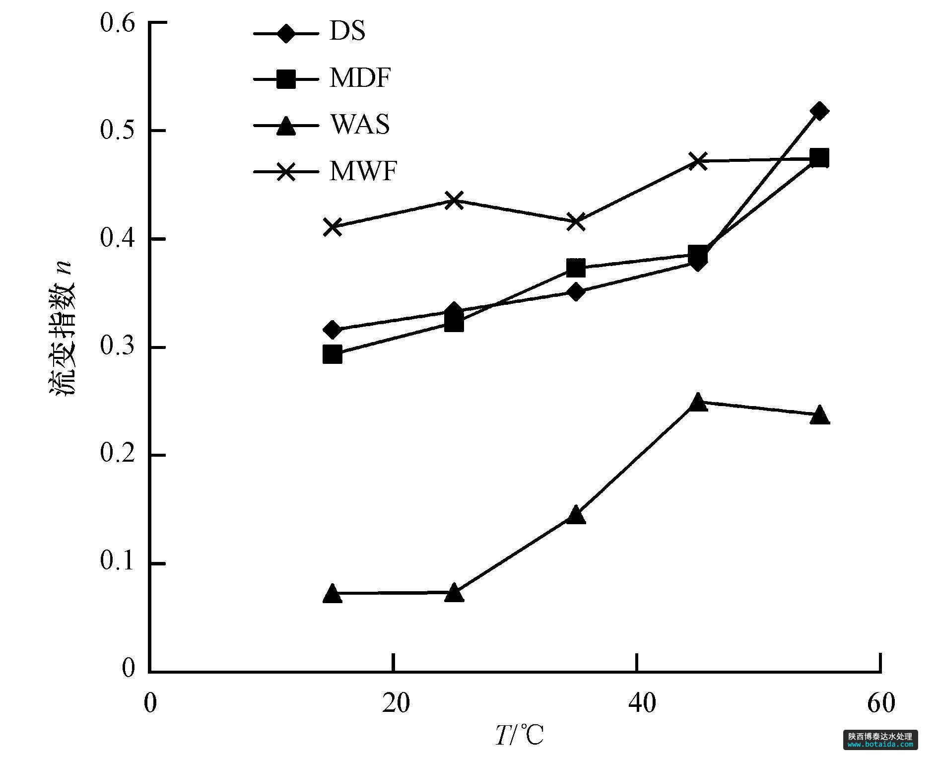 TS為5%時4種原料流變指數(shù)隨溫度的變化情況如圖 5所示.由圖 5可以看出4種原料的流變指數(shù)隨著溫度的升高而增大.這說明溫度越高,這4種原料的流變性質(zhì)越接近牛頓流體.在這4種原料中,可以明顯的看出WAS的流變指數(shù)最小,偏離牛頓流體的程度最大;MWF的流變指數(shù)最大,最趨向于牛頓流體.通過對原始餐廚垃圾的流變特性分析,含水率為81.54%的未稀釋餐廚的黏度為1814 mPa · s,流變指數(shù)為0.6177,流變指數(shù)大于本文所研究的4種原料的任何1種;可能是餐廚垃圾較純污泥更趨向于牛頓流體,餐廚垃圾的加入導(dǎo)致污泥流變特性的改變,使得混合液較純泥更趨向于牛頓流體.DS的流變指數(shù)升高的幅度較大,其余3種原料升高的幅度較小.這說明相對于其他3種原料,DS的黏度對溫度變化更敏感。