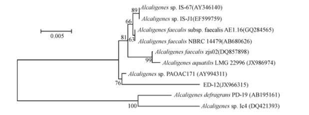 經(jīng)測序,獲得片段長度為1463 bp的部分16S rRNA基因序列,GenBank登錄號為JX966315. 在NCBI數(shù)據(jù)庫的比對結(jié)果表明,該菌株與Alicaligenes sp.的相似性達(dá)98%以上,推測其為Alicaligenes sp. 選擇序列相關(guān)性較高的76個16S rRNA序列,用Cluxtal X序列分析軟件分析其與ED-12的序列同源可靠性,選9個可信度較高的序列用MEGA 4.0軟件通過N-J法構(gòu)建系統(tǒng)發(fā)育樹,確定ED-12的進(jìn)化地位,結(jié)果如圖 1所示.