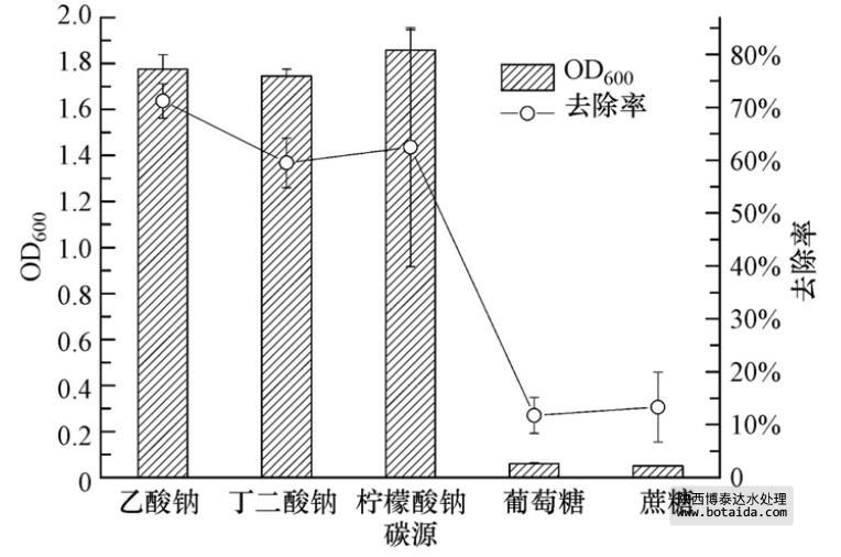以乙酸鈉、丁二酸鈉、檸檬酸鈉、葡萄糖和蔗糖為碳源,菌株ED-12的生長及除磷能力結(jié)果如圖 3所示,菌株ED-12在以葡萄糖和蔗糖為碳源時基本不生長,對PO3-4-P的去除率低于15%. 而菌株在以乙酸鈉、丁二酸鈉、檸檬酸鈉為碳源時長勢較好,且對PO3-4-P的去除率都在50%以上. 其中,以乙酸鈉為碳源時,菌株ED-12生長最旺盛,對PO3-4-P的去除率達(dá)到了70%以上. 對比5種碳源結(jié)構(gòu)與分子量,相對而言,在分子結(jié)構(gòu)簡單、分子量低的情況下,聚磷菌的生長較好,且能達(dá)到一個較高的除磷率,這與前述觀點相符. 此外,聚磷菌對不同碳源的利用效果可能還與其本身對碳源的親和性或其他特性有關(guān).