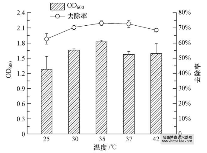 由圖 7可知,隨著溫度的升高,聚磷菌ED-12菌株的生物量也增大,35 ℃時最適宜ED-12菌株的生長. 相應(yīng)地,ED-12菌株對PO3-4-P的去除率也呈先增后減的趨勢,在35 ℃時達(dá)到最大值(73.14%±1.65%). 由此可知,不同溫度對聚磷菌ED-12菌株除磷效果的影響比對其生長的影響大得多.溫度對聚磷效果存在影響,這與Panswad等(2003)的研究結(jié)果相符,即35 ℃最有利于聚磷菌發(fā)揮聚磷作用,過高或過低的溫度都會抑制其效果,說明不同的微生物聚磷特性存在差異.
