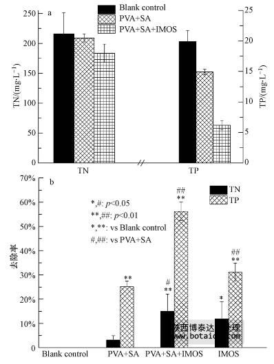 根據(jù)賴子尼等(2008)的實驗配方制備的固定化聚磷微生物小球的彈性與機械強度較好,對含氮磷廢水的凈化效果表明,菌球?qū)α子休^強的去除能力(從(19.91±1.81)mg · L-1 降至(6.19±0.76)mg · L-1),同時能夠去除一定的氮(從(215.82±35.29)mg · L-1 降至(183.42±15.35)mg · L-1)(圖 10 a). 二者的去除率分別達(dá)56.21%和15.01%(圖 10 b). 其中,固定化材料對氮的吸附比例較小,而對磷的吸附較顯著(p<0.01),這可能與固定化材料的表面官能團及CaCl2等對PO3-4的親和力強于NO-3有關(guān). 同時,固定化微生物(IMOs)對磷的去除效果也優(yōu)于氮,說明菌株ED-12可能不具備反硝化能力,對氮的利用僅是生長所需. 由PVA+SA+IMOs組與PVA+SA組比較可知(圖 10b,#表示),無論是氮還是磷,都存在顯著差異,說明固定化微生物是氮磷去除的主要貢獻(xiàn)者.