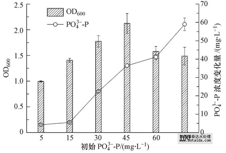 聚磷菌對磷的去除包括兩條途徑:生長利用和異染顆粒貯磷.根據(jù)聚磷菌分離篩選原理,過高濃度的PO3-4-P會抑制聚磷菌的生長與繁殖. 因此,考察不同起始濃度的PO3-4-P對聚磷菌生長的影響及相應(yīng)條件下聚磷菌對PO3-4-P的去除效果,對分析聚磷菌生長與聚磷過程的關(guān)系及指導(dǎo)聚磷菌在富營養(yǎng)化水體中的工程應(yīng)用有實際意義.