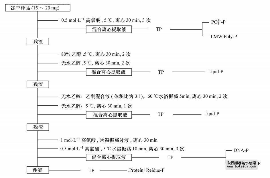 污泥和細(xì)菌細(xì)胞中不同形態(tài)磷含量的測定采用改進(jìn)的STS法,具體測量步驟見圖 1.該法將樣品中的磷分為正磷酸鹽(PO3-4-P)、低分子量聚磷酸鹽(LMW Poly-P)、磷脂(Lipid-P)、DNA磷(DNA-P)、高分子量聚磷酸鹽(HMW Poly-P)、蛋白質(zhì)磷和殘?jiān)?Protein+Residue-P).混合離心提取液中TP含量測定時(shí)采用封閉回流消解法預(yù)處理,用鉬銻抗法測定TP和PO3-4-P含量,DNA-P含量由DNA含量乘以系數(shù)9.2%計(jì)算得到(磷是DNA的特征元素,含量相對(duì)恒定),差減計(jì)算得到LMW Poly-P和HMW Poly-P含量.