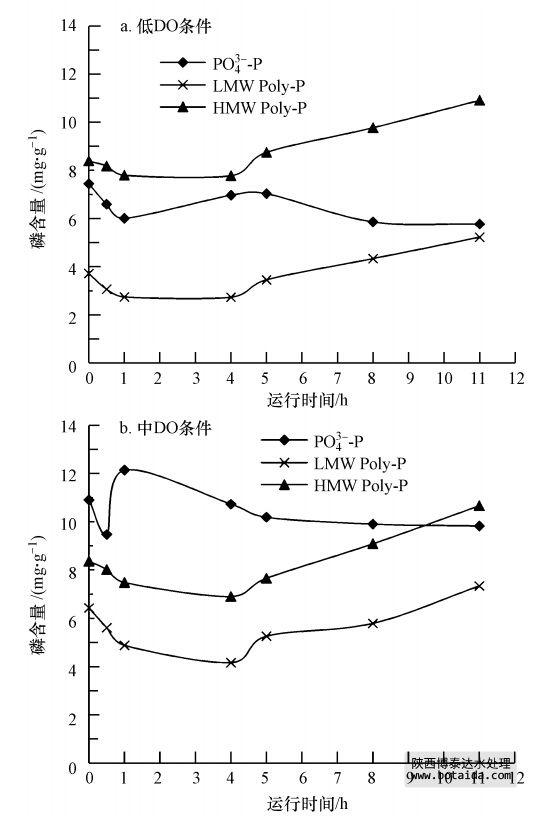 3)EPS不僅是生物除磷過程的中轉(zhuǎn)站,而且參與了生物聚磷過程.EPS的LMW Poly-P和HMW Poly-P含量均表現(xiàn)厭氧降低和好氧升高的變化規(guī)律;對(duì)于相同SRT的污泥,中DO(2.5~3.5 mg · L-1)條件較低DO(0.7~1.0 mg · L-1)條件下EPS的LMW Poly-P和HMW Poly-P有更大的厭氧降低量和好氧升高量,對(duì)應(yīng)著更明顯的生物除磷過程.