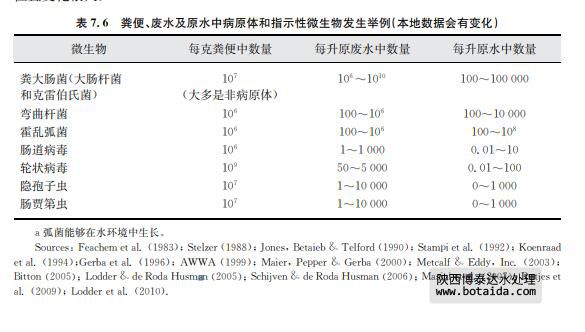 在社區(qū)或?qū)嵤┑貐^(qū),當缺少水源病原體發(fā)生和分布的數(shù)據(jù)時,原水中的濃度可以從一些 觀察數(shù)據(jù),如每克代表直接受糞便污染的糞便中或每升未處理的廢水中的病原體數(shù)量推斷 出來(表7.6)。衛(wèi)生調(diào)查數(shù)據(jù)可用于評估未經(jīng)處理或處理過的廢水排入原水產(chǎn)生的影響。 在處理過的廢水中,病原體的濃度可能減少10~100倍或者更多,這取決于處理工藝效率。 原水中的病原體濃度可以通過廢水中的病原體濃度及廢水在原水中的比例估計。此外,還 可以考慮在一些特定位置的原水中測定的指示性病原體的濃度,但這些濃度可能會在不同 位置變化很大。