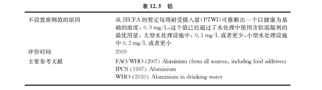 盡管鋁廣泛存在于食物、飲用水及抗酸劑中,很少有跡象表明經(jīng)口攝入鋁會引起人急性 中毒。有一種假設認為鋁的攝入會增加人類老年癡呆癥發(fā)病風險。1997年 WHO發(fā)布的 環(huán)境健康標準中對鋁作出規(guī)定(見表12.5)。