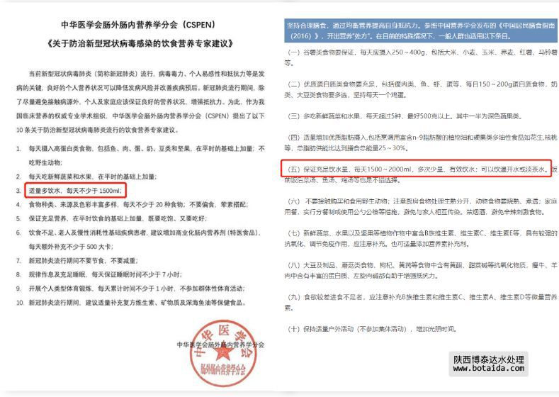 中國營養(yǎng)學(xué)會、中華醫(yī)學(xué)會、地方衛(wèi)健委等機(jī)構(gòu)發(fā)布的“防治新冠病毒感染的飲食指南”中,也多次提到要保證每天1500ml~2000ml的飲水量,多次少量,有效飲水。