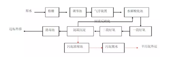 污水處理系統(tǒng)由調(diào)節(jié)池、缺氧池、好氧池(接觸氧化池)、二沉池組成。來自生產(chǎn)車間的污水自流入調(diào)節(jié)池,調(diào)節(jié)池入口設(shè)機(jī)械格柵,以攔截大顆粒狀和纖維狀雜質(zhì),在調(diào)節(jié)池中污水充分地混合,調(diào)節(jié)水量并初步降解有機(jī)物,然后通過污水泵將污水輸入氣浮池,去除油污,懸浮物進(jìn)入缺氧池,在缺氧池中回流混合液與原污水充分混合,通過兼氧微生物的作用,將亞硝酸氮和硝酸氮轉(zhuǎn)化為氮?dú)?,完成反硝化脫氮,缺氧池出水自流入接觸氧化池。接觸氧化池是一種以生物膜法為主,兼有活性污泥法的生物處理裝置,通過鼓風(fēng)機(jī)提供氧源,使污水中的有機(jī)物與池內(nèi)生物膜充分接觸,經(jīng)微生物吸附、降解作用,使水質(zhì)得到凈化。二沉池出水進(jìn)入混凝沉淀,進(jìn)一步去除污染物,使出水達(dá)標(biāo)排放。