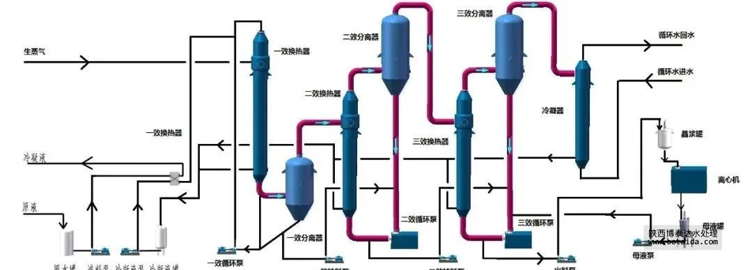 三組蒸發(fā)器以串聯(lián)的形式運(yùn)行,組成三效結(jié)晶蒸發(fā)器。整套蒸發(fā)系統(tǒng)采用連續(xù)進(jìn)料、連續(xù)出料的生產(chǎn)方式。高含鹽廢水首先進(jìn)入一效強(qiáng)制循環(huán)結(jié)晶蒸發(fā)器,結(jié)晶蒸發(fā)器配有循環(huán)泵,將廢水打人蒸發(fā)換熱室,在蒸發(fā)換熱室內(nèi),外接蒸氣液化產(chǎn)生汽化潛熱,對(duì)廢水進(jìn)行加熱。由于蒸發(fā)換熱室內(nèi)壓力較大,廢水在蒸發(fā)換熱室中在高于正常液體沸點(diǎn)壓力下加熱至過熱.加熱后的液體進(jìn)入結(jié)晶蒸發(fā)室后,廢水的壓力迅速下降導(dǎo)致部分廢水閃蒸,或迅速沸騰。廢水蒸發(fā)后的蒸氣進(jìn)人二效強(qiáng)制循環(huán)蒸發(fā)器作為動(dòng)力蒸氣對(duì)二效蒸發(fā)器進(jìn)行加熱,未蒸發(fā)廢水和鹽分暫存在結(jié)晶蒸發(fā)室。一效、二效、三效強(qiáng)制循環(huán)蒸發(fā)器之間通過平衡管相通,在負(fù)壓的作用下,高含鹽廢水由一效向二效、三效依次流動(dòng),廢水不斷地被蒸發(fā),廢水中鹽的濃度越來越高,當(dāng)廢水中的鹽分超過飽和狀態(tài)時(shí),水中鹽分就會(huì)不斷地析出,進(jìn)入蒸發(fā)結(jié)晶室的下部的集鹽室.吸鹽泵不斷將含鹽的廢水送至旋渦鹽分離器,在旋渦鹽分離器內(nèi),固態(tài)的鹽被分離進(jìn)入儲(chǔ)鹽池,分離后的廢水進(jìn)入二效強(qiáng)制循環(huán)蒸發(fā)器加熱,整個(gè)過程周而復(fù)始,實(shí)現(xiàn)水與鹽的最終分離.