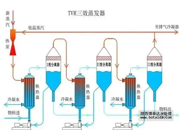 MVR蒸發(fā):MVR蒸發(fā)器由加熱器、分離器、預(yù)熱器、蒸汽壓縮機(jī)、泵組、稠厚器、母液罐、離心機(jī)、電氣儀表控制及閥門、管路等組成。