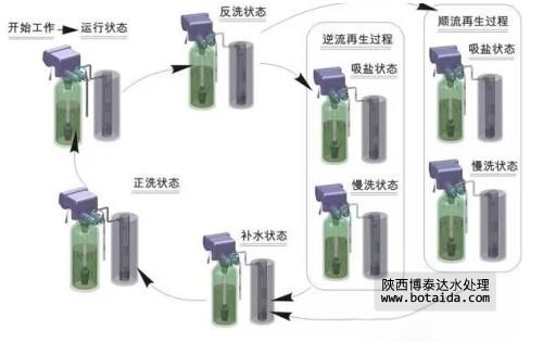 由于實(shí)際工作的需要, 軟化水設(shè)備的標(biāo)準(zhǔn)工作流程主要包括:工作(有時叫做產(chǎn)水)→反洗→吸鹽(再生)→慢沖洗(置換)→快沖洗五個過程。不同軟化水設(shè)備的所有工序非常接近,只是由于實(shí)際工藝的不同或控制的需要,可能會有一些附加的流程。任何以鈉離子交換為基礎(chǔ)的軟化水設(shè)備都是在這五個流程的基礎(chǔ)上發(fā)展來的(其中,全自動軟化水設(shè)備會增加鹽水重注過程)。