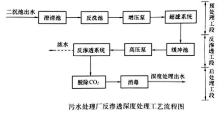以污水處理廠出水作為原水的反滲透工藝為例描述反滲透工藝流程,如下圖所示。